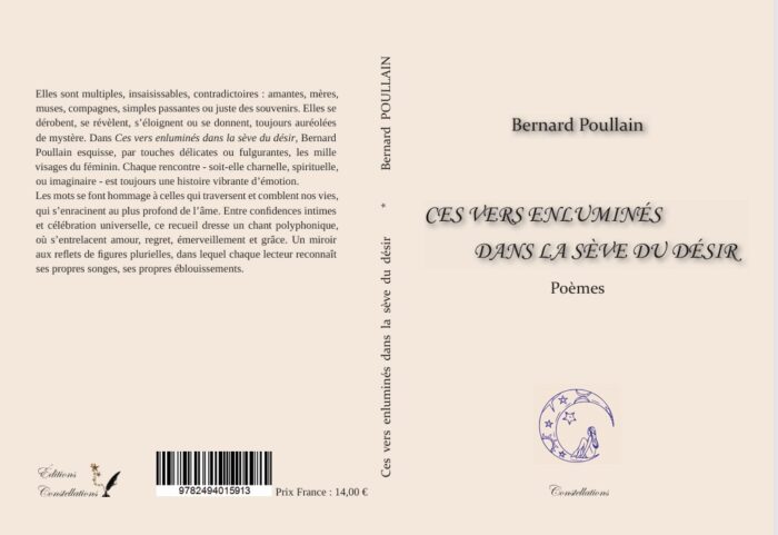 dérobent, se révèlent, s’éloignent ou se donnent, toujours auréolées de mystère. Dans Ces vers enluminés dans la sève du désir, Bernard Poullain esquisse, par touches délicates ou fulgurantes, les mille visages du féminin. Chaque rencontre – soit-elle charnelle, spirituelle, ou imaginaire – est toujours une histoire vibrante d’émotion.