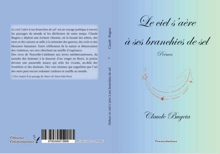 « Le ciel s’aère à ses branchies de sel »(1) est un voyage poétique à travers les paysages du monde et les déchirures de notre temps. Claude Bugeia y déploie une écriture vibrante, où la beauté des arbres, des mers et des saisons se mêle à la mémoire des guerres, des exils et des blessures humaines. Entre célébration de la nature et dénonciation des violences, ses vers cherchent un souffle d’espérance.